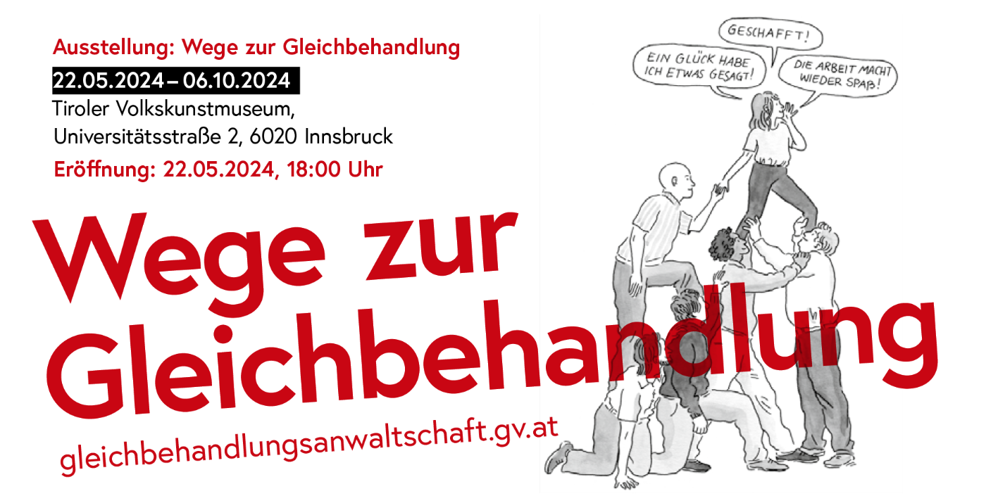 Die Gleichbehandlungsanwaltschaft lädt herzlich zur Eröffnung der Ausstellung „Wege zur Gleichbehandlung“ am 22. Mai 2024 um 18:00 Uhr im Tiroler Volkskunstmuseum in Innsbruck ein.