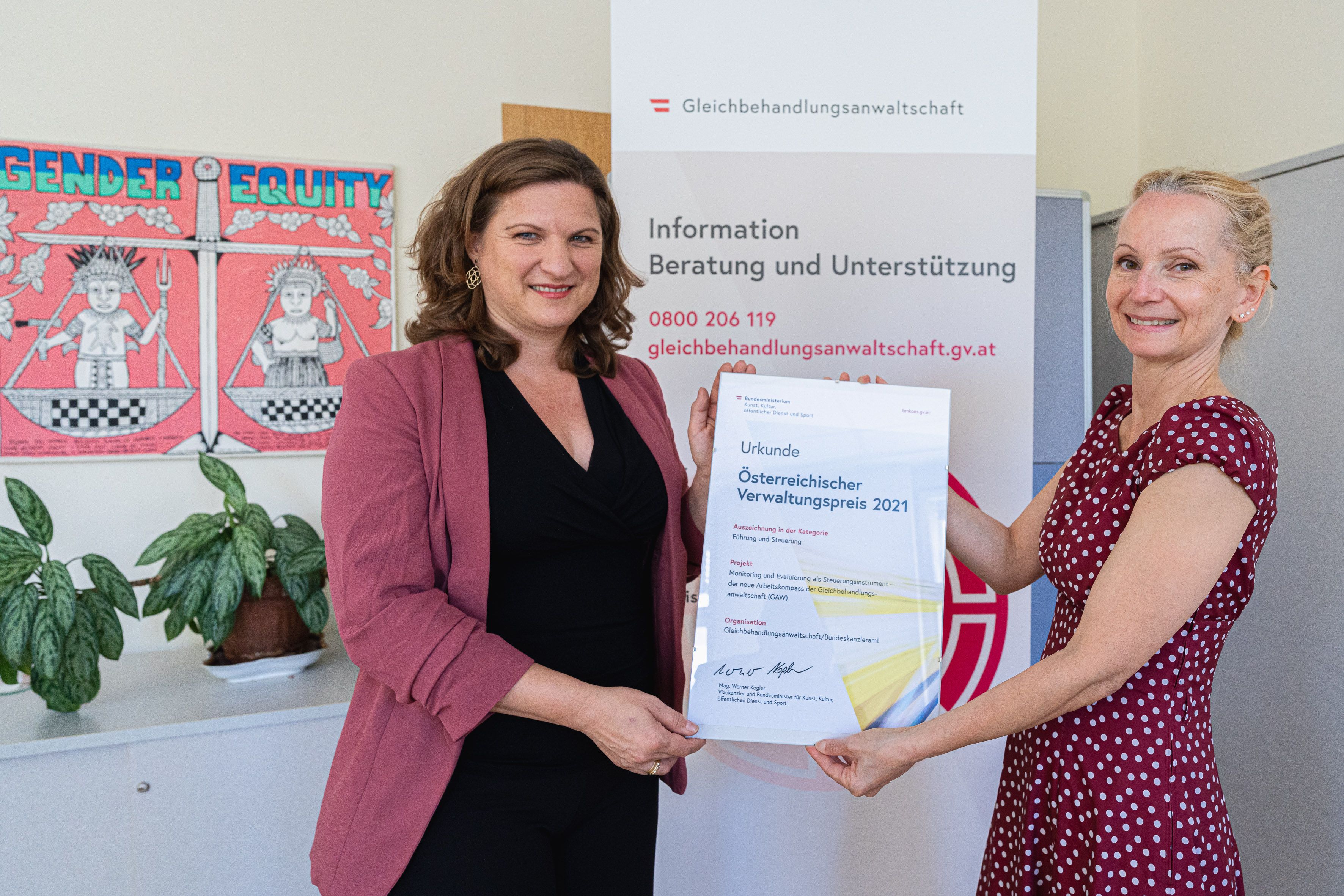 Der Verwaltungspreis prämiert jedes zweite Jahr zukunftsweisende Projekte der Gemeinden, Länder und der Bundesverwaltung. Für die eingeführte spezielle Wirkungsorientierung, die sich an einem datenbasierten Monitoring- und Evaluierungszyklus orientiert, erhielt die GAW eine Urkunde in der Kategorie „Führung und Steuerung“ und landete unter den besten vier teilnehmenden Projekten.